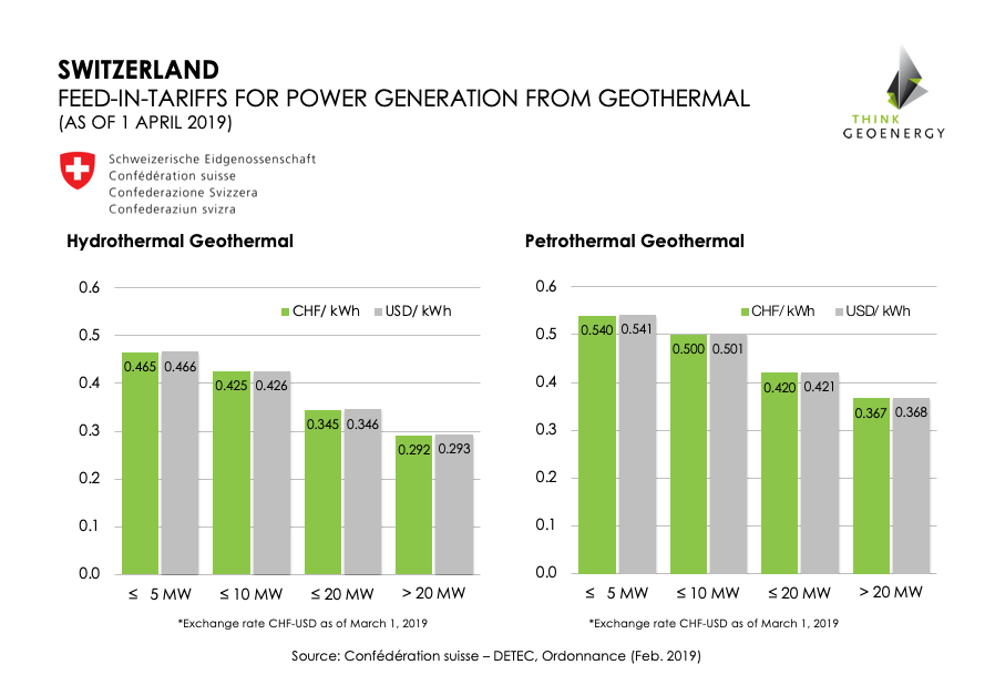İsviçre hükümeti, solar PV ve jeotermal için tarife beslemelerinde değişiklik yaparak, oranları jeotermal için 0.293 $ / 0.541 / kWh arasında arttırdı.