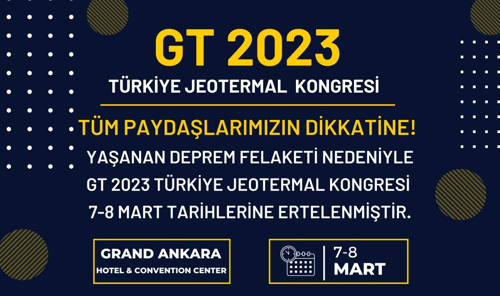 Jeotermal Elektrik Santral Yatırımcıları Derneği (JESDER) tarafından düzenlenen GT 2023 – Türkiye Jeotermal Kongresi 15- 16 Şubat tarihlerinde gerçekleştirilecekti. Yaşanan deprem felaketi nedeniyle GT’23, 7-8 Mart tarihlerine ertelenmiştir. Kongre, yine Grand Ankara Otel’de düzenlenecektir.