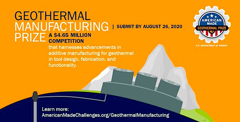 Amerikan Yapımı Jeotermal Üretim Ödülü, 3D baskı kullanarak jeotermal enerji teknolojisini geliştirmeyi amaçlayan bir yarışmadır. Yüksek sıcaklıklar, yüksek basınç, aşındırıcı sıvılar ve yüksek kaya mukavemeti gibi zorlu jeotermal koşulların zorluklarını ele almak için gelişmiş hızlı üretim teknolojilerinden yararlanmak için enerji inkübatörleri, yatırımcılar, üniversiteler, ulusal laboratuvarlar ve diğerleri ile birlikte çalışır.