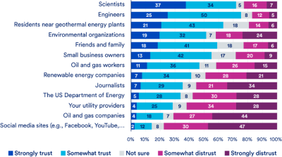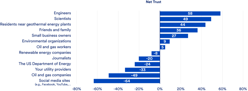 Aynı zamanda, CATF’nin araştırması, ABD’de kurumlara ve bilgi kaynaklarına duyulan güven düzeylerinde eşitsizlikler olduğunu vurguluyor. Sosyal medya, petrol ve doğalgaz şirketleri ve ardından ABD Enerji Bakanlığı, güvenilirlik düzeyi konusunda sıklıkla şüpheyle karşılanıyor ve bu durum, güvence olarak büyük ölçüde düzenleyici denetime dayanan iletişim stratejilerini karmaşıklaştırıyor. Jeotermal tesislerin yakınında yaşayan bilim insanları, mühendisler ve yerel sakinler için güven düzeyleri daha olumlu bir şekilde değişiyor ve bu da kamu iletişiminde üçüncü taraf doğrulayıcıların değerini pekiştiriyor.