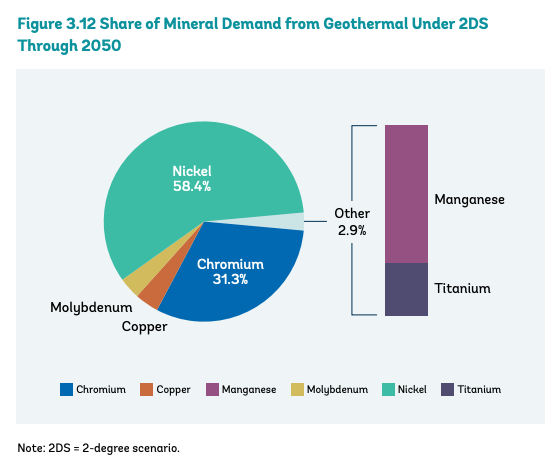 Dünya Bankası tarafından yapılan tahminlerde, Nikel ve Krom’a olan talep, en büyük mineral payını, daha da önemlisi, Titanyum’a yönelik nispeten büyük talebi, jeotermal için, yenilenebilir enerji teknolojileri ile toplam Titanyum talebinin yaklaşık % 64’ünü temsil ediyor.