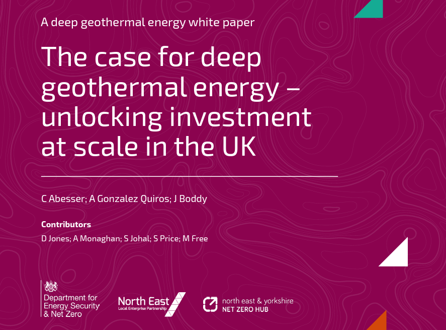 Enerji Güvenliği ve Net Sıfır Departmanı ile Kuzey Doğu ve Yorkshire Net Sıfır Merkezi’nin finansmanıyla Kuzey Doğu Yerel İşletme Ortaklığı, “Derin jeotermal enerji vakası – Birleşik Krallık’ta büyük ölçekte yatırımın kilidini açmak” başlıklı bir Beyaz Kitap yayınladı . British Geological Survey, Arup ile işbirliği içinde bu Beyaz Kitabı geliştirmekle görevlendirildi.