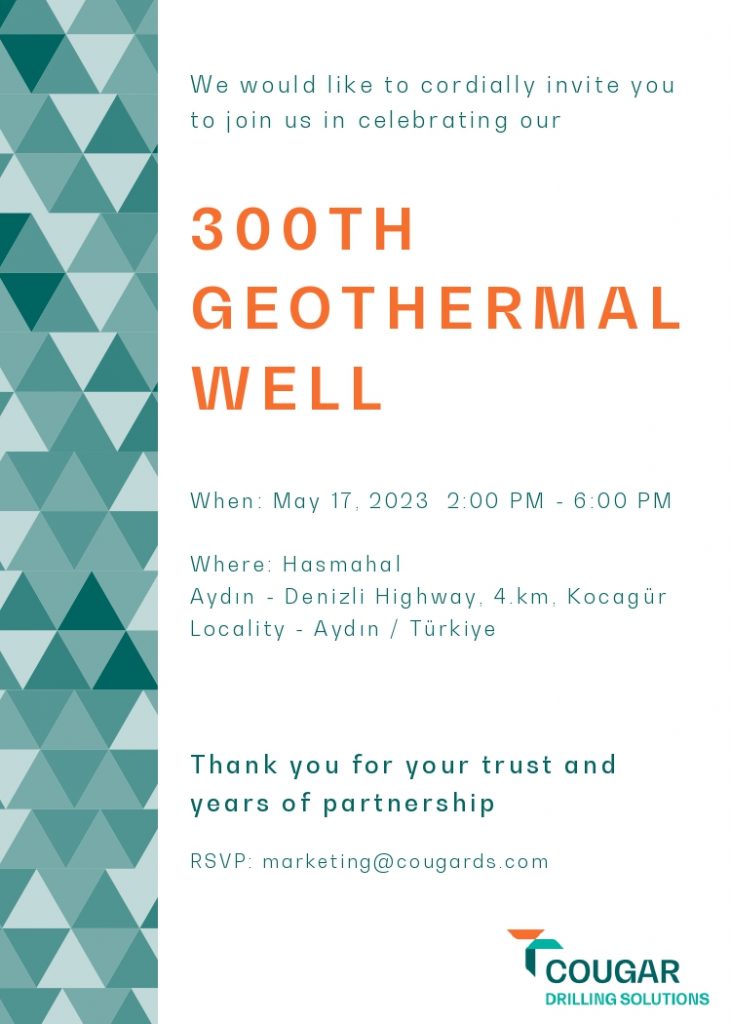 Cougar Drilling Solutions, Aydın’da şirket çalışanları, yüklenici firma temsilcileri ve müşterileri ile birlikte jeotermal projelerde 300. yönlü sondaj operasyonunun tamamlanmasını kutlamak için 17 Mayıs 2023 Çarşamba günü bir tören düzenliyor.