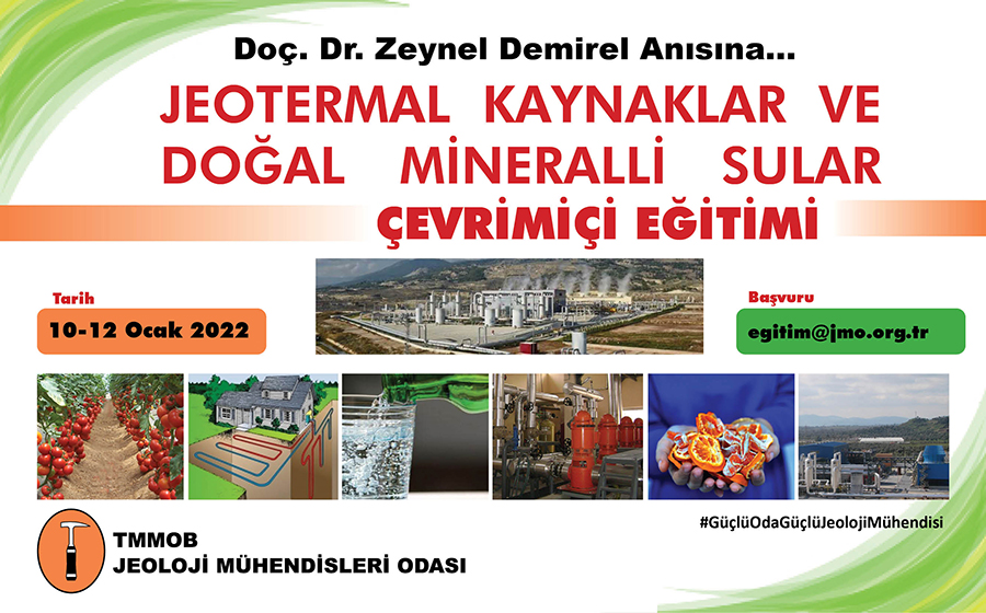 TMMOB Jeoloji Mühendisleri Odası’nın düzenlediği “Jeotermal Kaynaklar ve Doğal Mineralli Sular Eğitim Semineri”, 10 – 12 Ocak 2022 tarihleri arasında, online (çevrimiçi) olarak gerçekleştirilecek.