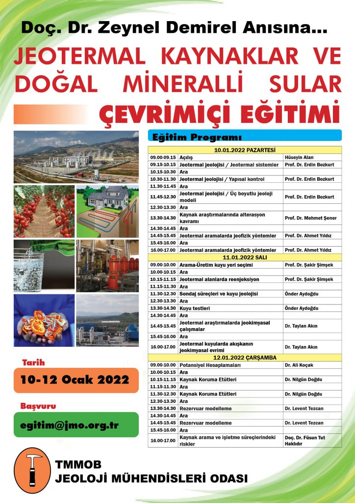 TMMOB Jeoloji Mühendisleri Odası’nın düzenlediği “Jeotermal Kaynaklar ve Doğal Mineralli Sular Eğitim Semineri”, 10 – 12 Ocak 2022 tarihleri arasında Online (Çevrimiçi) olarak gerçekleştirilecek.