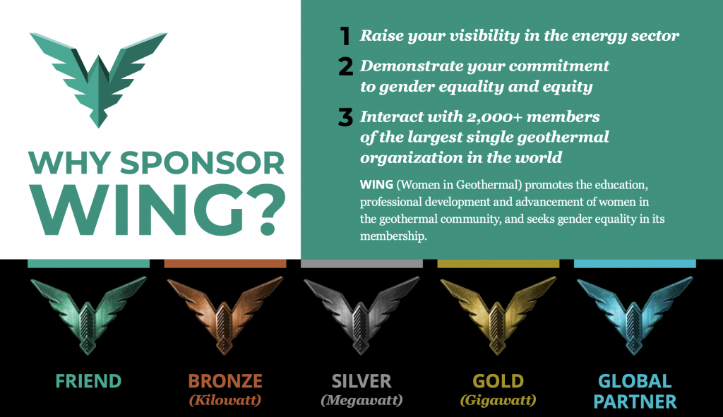 2013 yılında kurulan WING, 48 ülkeden yaklaşık 2.000 üyesi olan dünyanın en büyük, cinsiyet eşitliğine odaklanan ise tek jeotermal kuruluşu haline geldi. Üst düzey pozisyonlardaki kadınların yüzdesini artırmaya yönelik agresif bir stratejik plan ile WING, 2020 ortalarında ilk Geleceğin Liderleri Grubunu başlattı. Bu 17 akıllı, hırslı, orta kariyer kadından oluşan grup, liderlik ve yönetişim rollerine ilerlemek için gereken pratik eğitimi almaktalar. WING’in erişimi, jeotermal kuruluşların kurullarında hizmet veren ve jeotermal konferanslarda teknik belgeler sunan kadınların sayısını artırdı. WING liderliği, WING üyeleri ve WING sponsorlarının savunuculuğu ve desteği önemli ilerleme sağladı, ancak daha fazlasını başarmaya kararlılar.