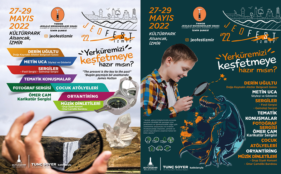 TMMOB Jeoloji Mühendisleri Odası İzmir Şubesi ve İzmir Büyükşehir Belediyesi işbirliği ile; 27-29 Mayıs 2022 tarihlerinde İzmir, Alsancak Kültürpark’ta, Türkiye`nin ilk Jeoloji festivali düzenleniyor.