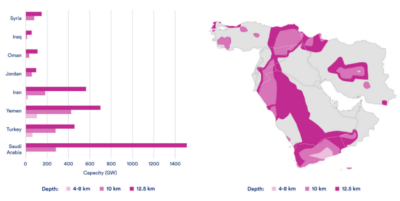 CATF tarafından geliştirilen ve +400 °C sıcaklıklara ulaşacak derinliği tahmin eden bir ısı modeline göre, Orta Doğu’nun kara alanının ~%40’ında, yani 2,5 milyon kilometrekareden fazla bir miktarda, 3 km ile 3 km arasındaki derinliklerde süper sıcak kayalar bulunmaktadır. 12,5 km. Bu potansiyelin büyük bir kısmı Suudi Arabistan Krallığı’nda bulunmaktadır.