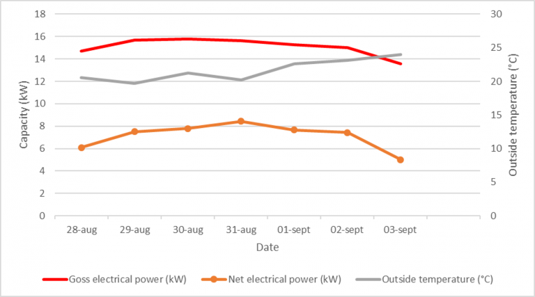 Şekil 3, Eylül ayı başında kaydedilen son hafta verilerini göstermektedir: 15 kW’lık ortalama brüt güç çıkışı ve 7 kW’lık ortalama net güç çıkışı kaydedilmiştir. “Net” değerinin ORC türbininin elektrik tüketimini, petrol kuyusu elektrik tüketimini değil, kompresör pompası gibi dikkate aldığını hatırlatmak gerekir.