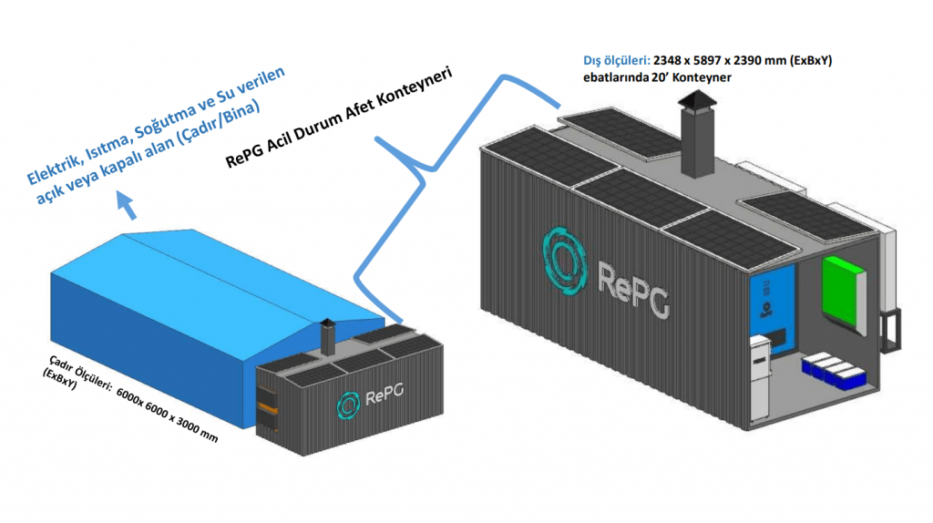 Çadır kentlere veya konteyner kentlere yerleştirilen RePG Şebeke Bağımsız Acil Durum Afet Konteyneri, tek bir noktadan birçok alana ulaşır. Atık ısılar ile elektrik üretir. Yalnızca çadır veya konteynerlerin içinin değil, kurulan kent alanının da aydınlanmasını sağlar. Hava fanları ile çadırlara sıcak hava doldurur; yer altından geçen boruları ile sıcak su akışını sağlayarak içme ve kullanım suyu; hem de ısınma imkanı tanır. Kısacası tüm altyapı şebekesi çökse dahi RePG, Şebeke Bağımsız Acil Durum Afet Konteyneri ile tüm altyapı sorununu kısa süre içerisinde çözüme kavuşturur; modüler şebeke altyapısı sağlar. Afet Toplanma bölgeleri, çadır kentler ve yardım destek merkezlerine küçük, akıllı enerji ve su altyapısı sağlar.