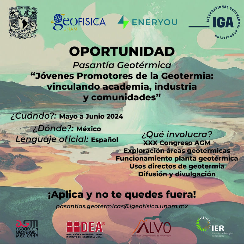 Jeotermal enerji alanında profesyonel olarak gelişmek isteyen motivasyonu yüksek gençler için Meksika’da staj programına başvurular şu anda kabul ediliyor. Program , Uluslararası Jeotermal Birliği (IGA), Meksika Ulusal Özerk Üniversitesi (UNAM) bünyesindeki Jeofizik Enstitüsü ve ENERYOU tarafından organize ediliyor.