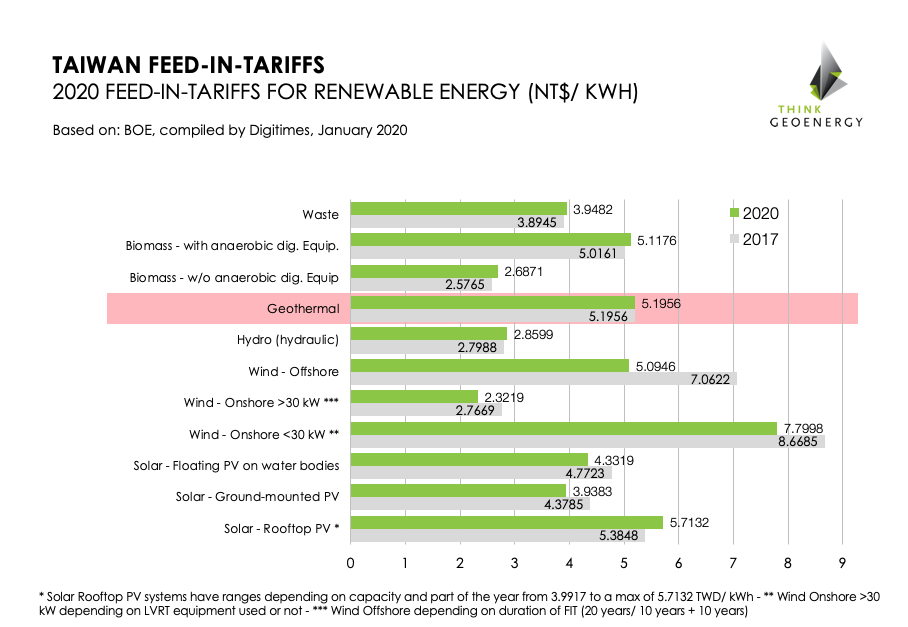 Jeotermal enerji için 2020 tarife garantileri 20 yıl boyunca NT $ / kWh 5.1956 (0.167 ABD Doları); İlk 10 yıl için 6.1710 (0.198 ABD Doları) ve sonraki 10 yıl için 3.5685 (0.115 ABD Doları) olarak duyuruldu.