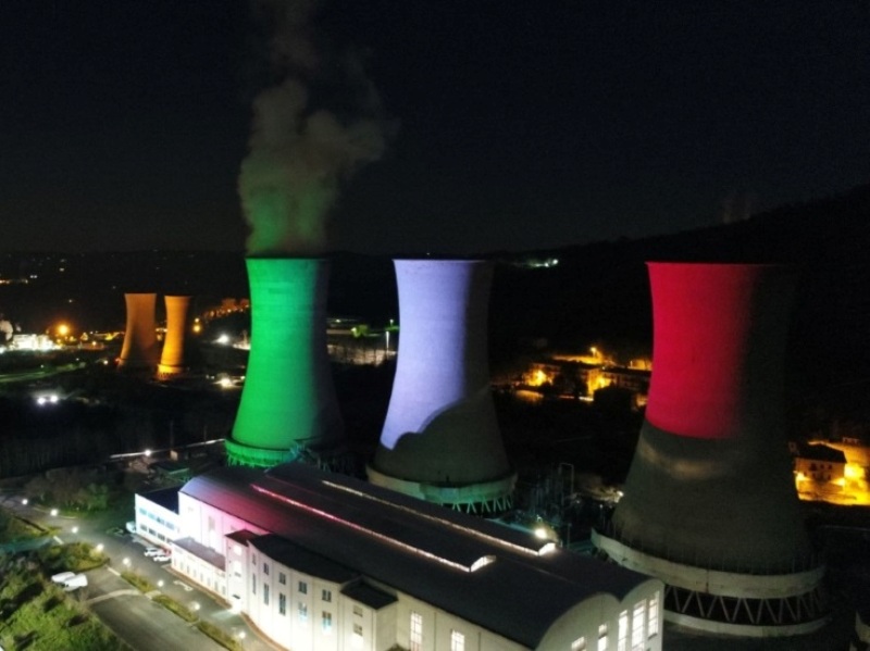İtalya covid-19 acil durumuyla mücadele ediyor ve kurumlar İtalyan renklerini göstererek desteklerini görselleştiriyorlar. Enel Green Power da, İtalyan bayrağının renklerini Toskana'daki Larderello jeotermal enerji santralinin soğutma kulelerine yansıtarak desteklere katılıyor.