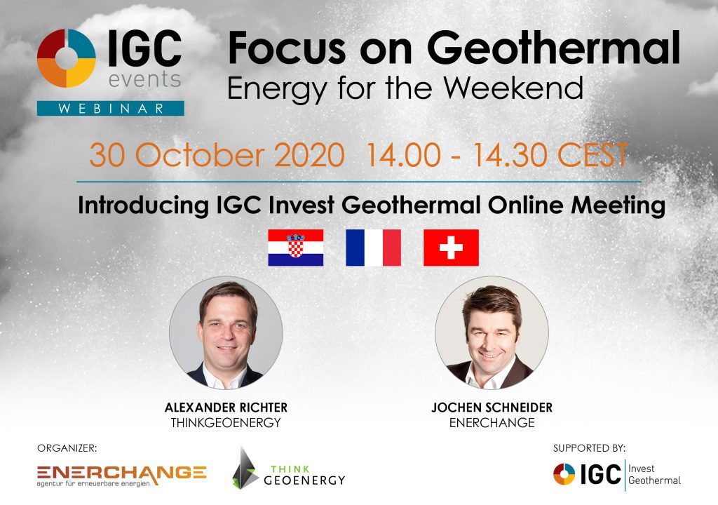 IGC Invest Jeotermal etkinliğinin bir parçası olarak bu haftanın sunumu Hırvatistan, Fransa ve İsviçre'deki jeotermal pazarları hakkında genel bir bakışpaylaşacak. Web semineri 30 Ekim 2020'de yapılacak.