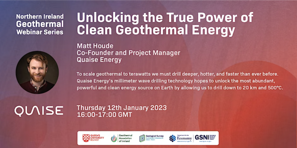 Kuzey İrlanda Jeolojik Araştırması, 12 Ocak 2023’te, Quaise Energy tarafından geliştirilen milimetre dalga teknolojisini ve 20 kilometreye kadar derinliklerde ve 500 santigrat derece sıcaklıklarda jeotermal kaynakları nasıl ortaya çıkarabileceğini tartışan bir web seminerine ev sahipliği yapacak.