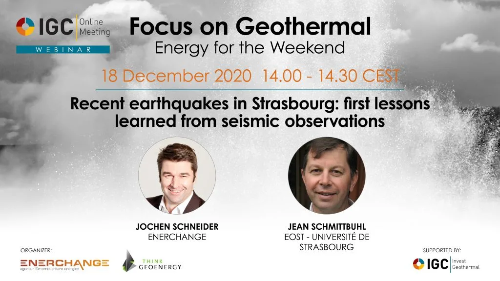 Fransa'nın Vendenheim kenti jeotermal projesinde sismik olaylar, mevcut faaliyetlerin durmasına ve medyanın yoğun ilgisine neden oldu. Olanları ve etkisini ele almak için, 18 Aralık 2020'de EOST ve Strasbourg CNRS'den Prof. Schmittbuhl ile gerçekleşecek web seminerine katılabilirsiniz.