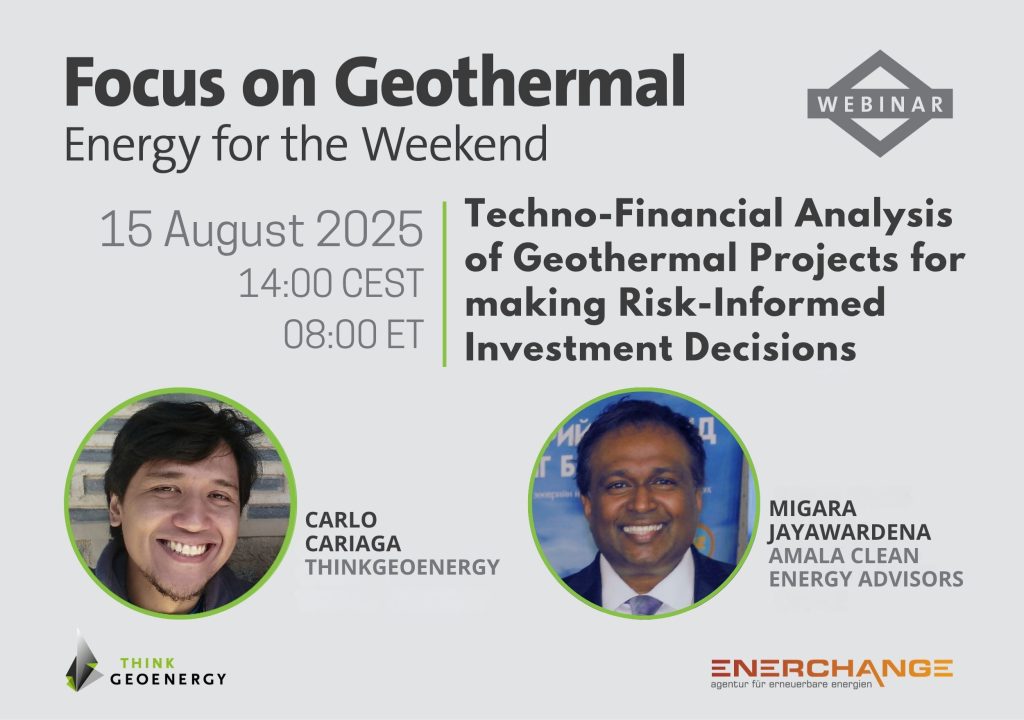 Düzenli olarak gerçekleştirilen Focus on Geothermal Webinar serisi kapsamında – Enerchange ve ThinkGeoEnergy iş birliğiyle – AMALA Clean Energy Advisors Genel Müdürü Migara Jayawardena’yı, “Jeotermal Projelerde Risk Odaklı Yatırım Kararları İçin Teknik-Finansal Analiz” konulu web seminerinde ağırlıyoruz.