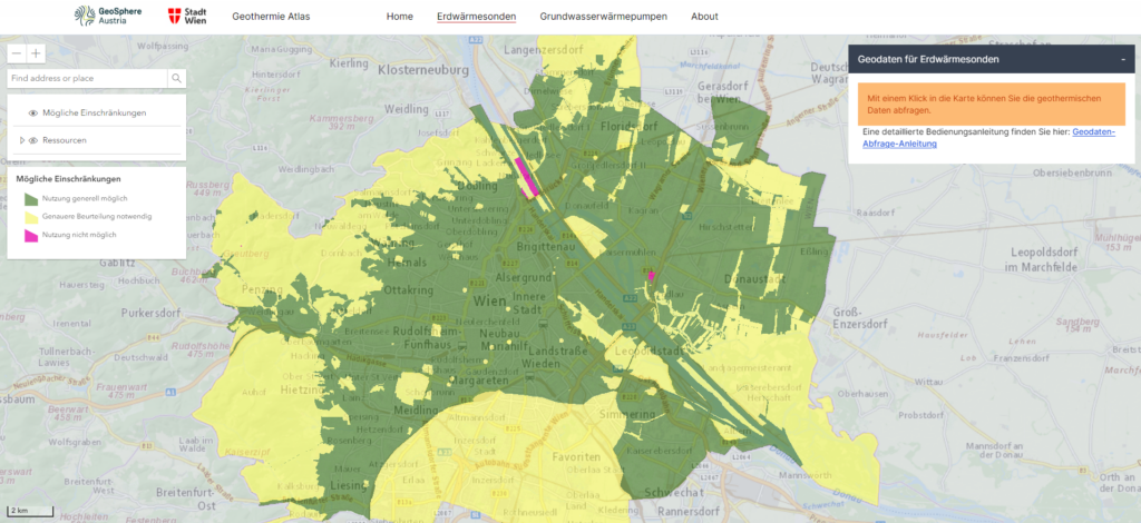 GeoSphere Avusturya, Avusturya’nın Viyana kentinde sığ jeotermal sistemlerin potansiyelini gösteren etkileşimli bir çevrimiçi araç olan Jeotermal Atlas’ı başlattı. Başlangıçta yalnızca Viyana için geçerli olmasına rağmen, bu projenin kapsamını Salzburg ve Styria’ya ve sonunda tüm Avusturya’ya genişletme çalışmaları devam ediyor.